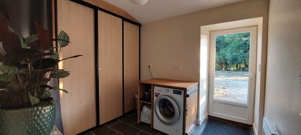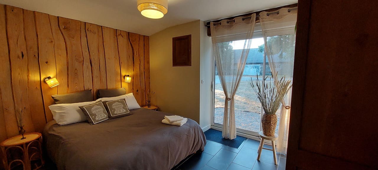 Située au rez-de-chaussée, la chambre des Blés offre un espace chaleureux, alliant authenticité et confort moderne. Habillée d’un magnifique mur en bois brut et baignée de lumière naturelle grâce à sa grande baie vitrée, cette chambre invite à la détente.