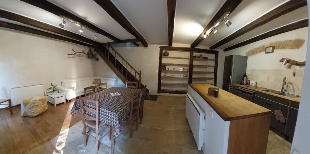 Ce salon cosy marie le charme de l’ancien (pierres apparentes, poutres en bois) au confort moderne. Vous y trouverez un grand canapé d’angle, une télévision, une table conviviale pour vos repas, et une décoration naturelle soignée. Un espace idéal pour se détendre après une journée de découvertes !